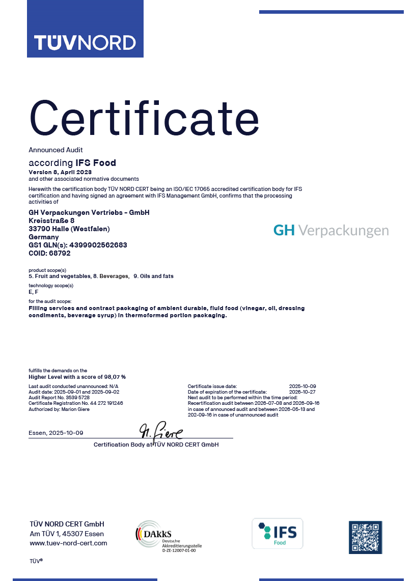 Our QM system is based on IFS Food, whose defined guidelines set us the task of food safety, conformity and consistent quality.
